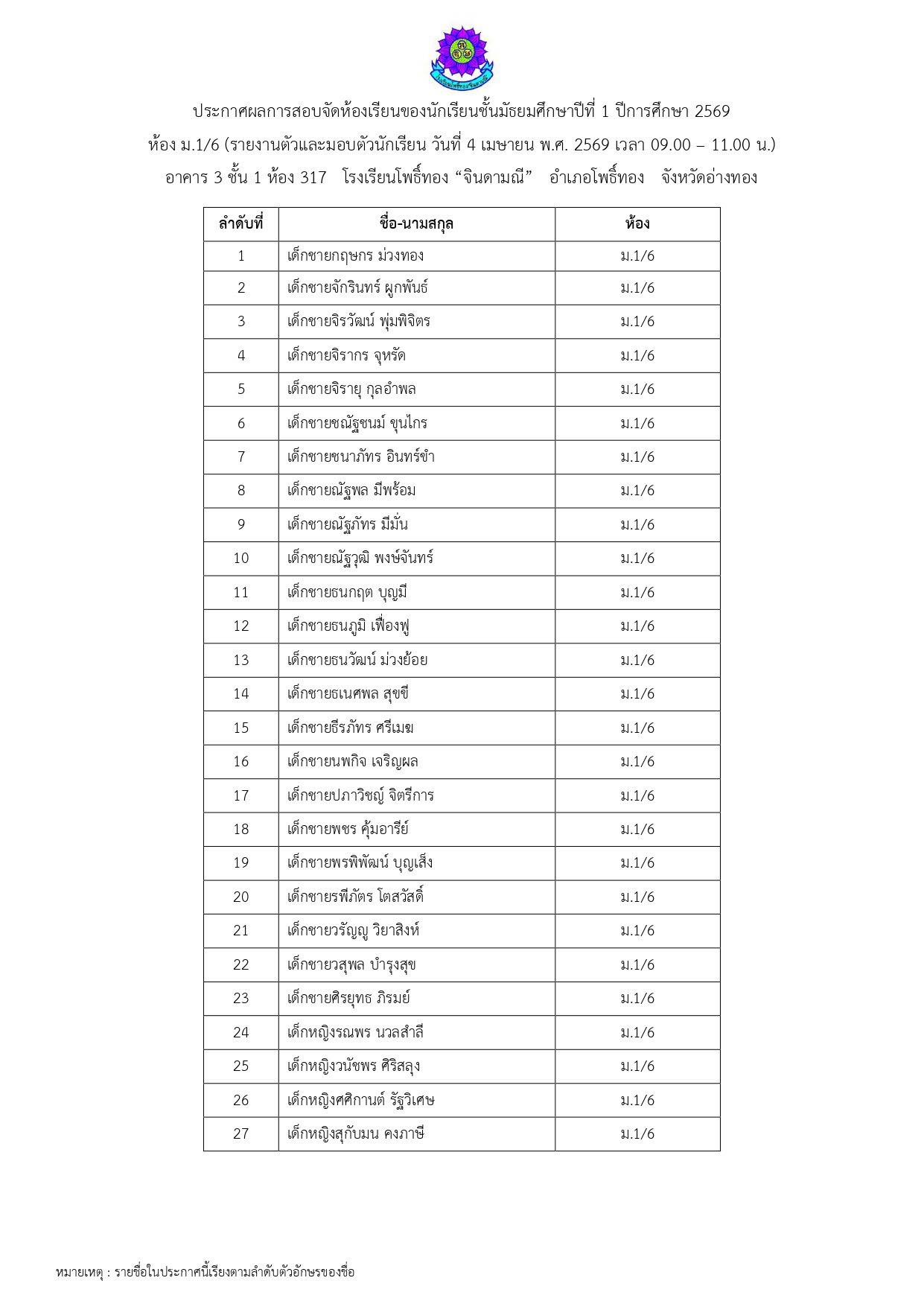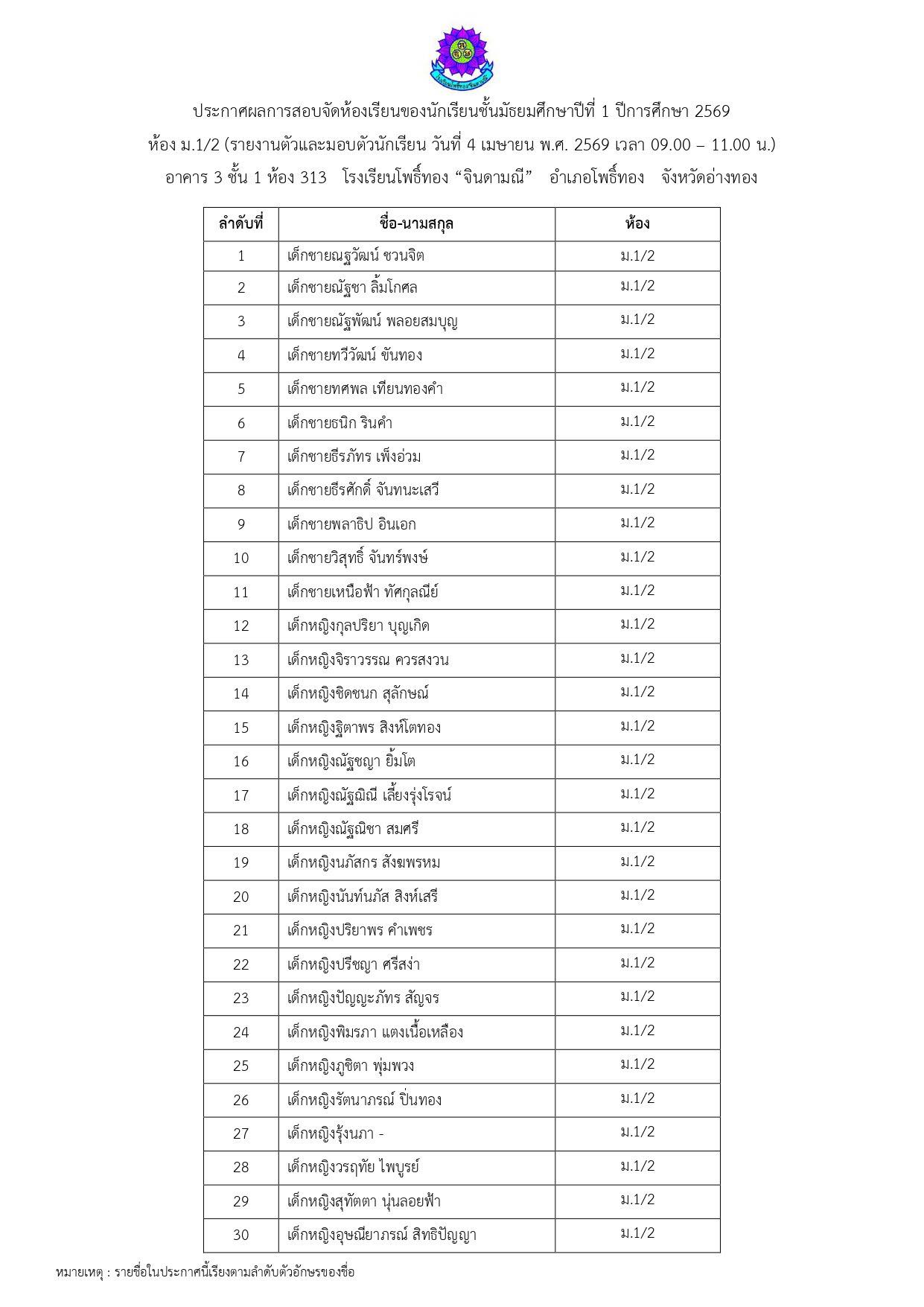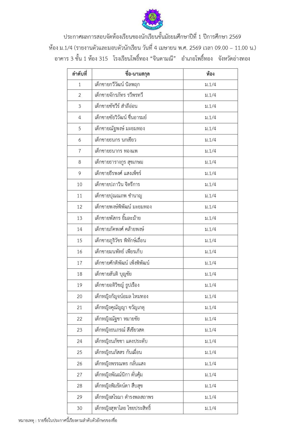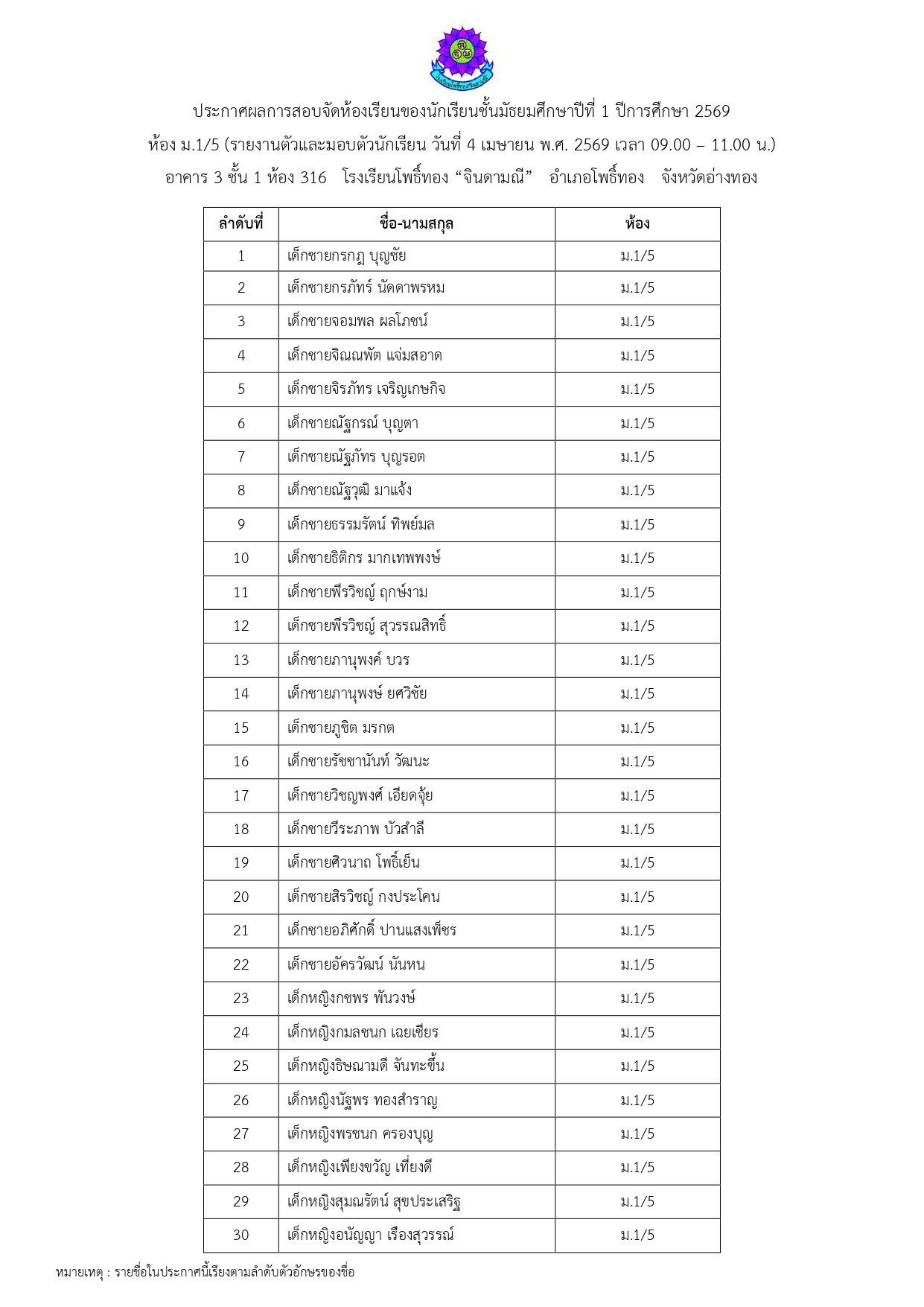 ประกาศผลการสอบจัดห้องเรียน ชั้นมัธยมศึกษาปีที่ 1