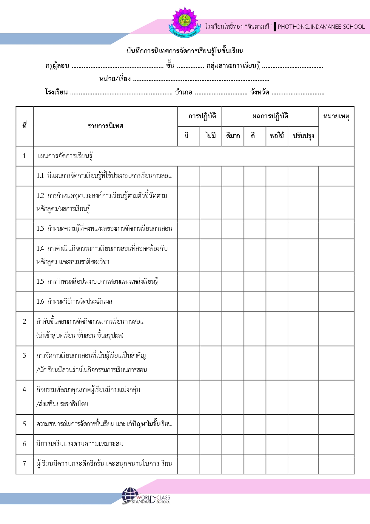 แบบบันทึกการนิเทศการจัดการเรียนรู้ในชั้นเรียน